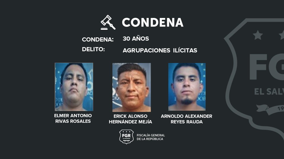 San Salvador. Condenas de prisión de 30 años cumplirán Erick Alonso Hernández Mejía, alias “pijullo”; Elmer Antonio Rivas Rosales, alias “skini” y Arnoldo Alexander Reyes Rauda, alias “blazer”, después que la Fiscalía General de la República demostró pertenencia a una estructura terrorista.
