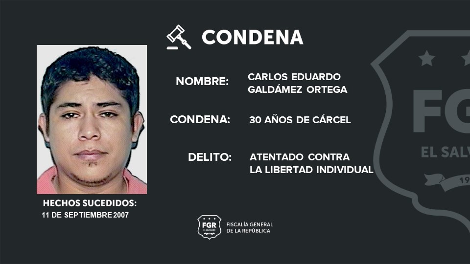 Santa Ana. José Rolando Cuellar Nieto y Carlos Eduardo Galdámez Ortega fueron condenados a 45 y 30 años de cárcel por el secuestro de una menor de edad en Santa Ana el 11 de septiembre de 2007. Las pruebas presentadas en el juicio por la Fiscalía evidenciaron la culpabilidad de los imputados en el delito de atentado contra la libertad individual.