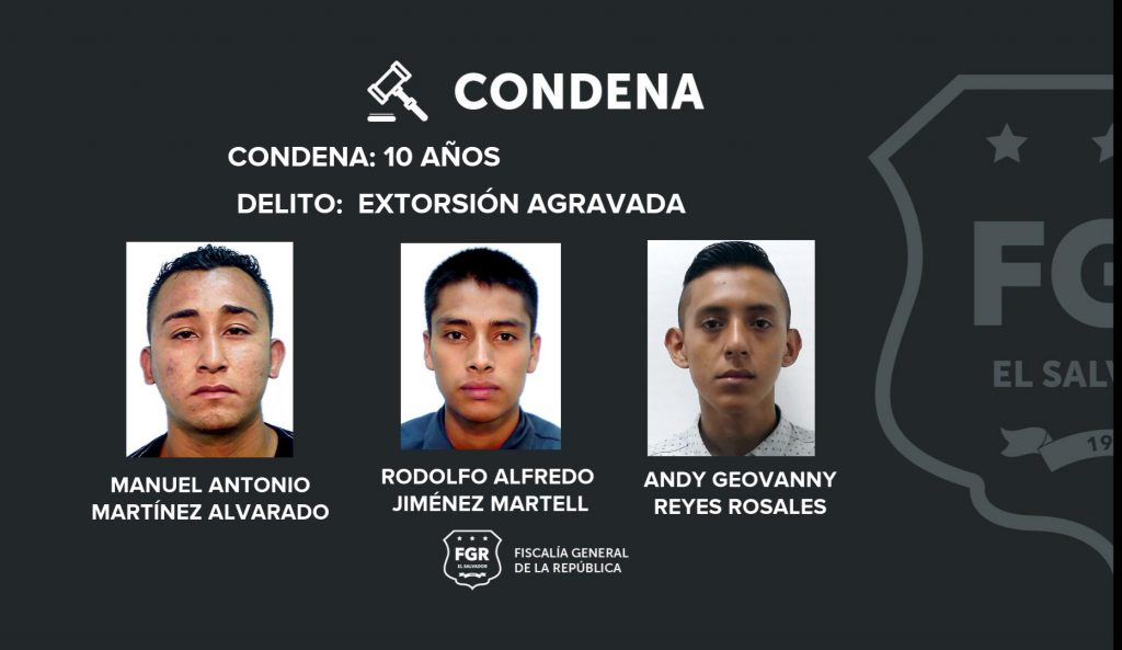 Soyapanago. Penas de 10 años de prisión deberán cumplir 3 extorsionistas que venían operando en la jurisdicción de Soyapango. Los involucrados en este caso son: Manuel Antonio Martínez Alvarado, Rodolfo Alfredo Jiménez Martell y Andi Geovany Reyes Rosales.