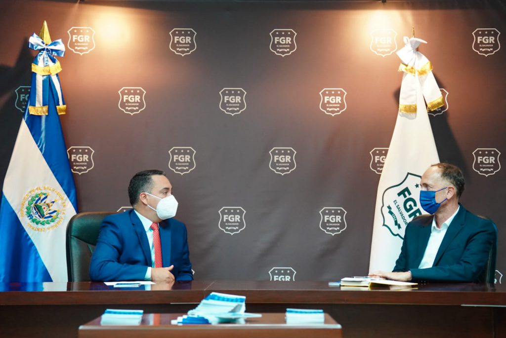 En el encuentro con los representantes de la Cooperación Alemana acompañaron al Fiscal General, la Licda. Lucrecia Yolanda Padilla, Auditora Fiscal y presidenta de la Comisión de Ética Gubernamental de la FGR, el Lic. Miguel Ángel Iraheta Joachín, Secretario General y la directora de la Escuela de Capacitación Fiscal, Licda. María Zenaida Rivera Gómez.