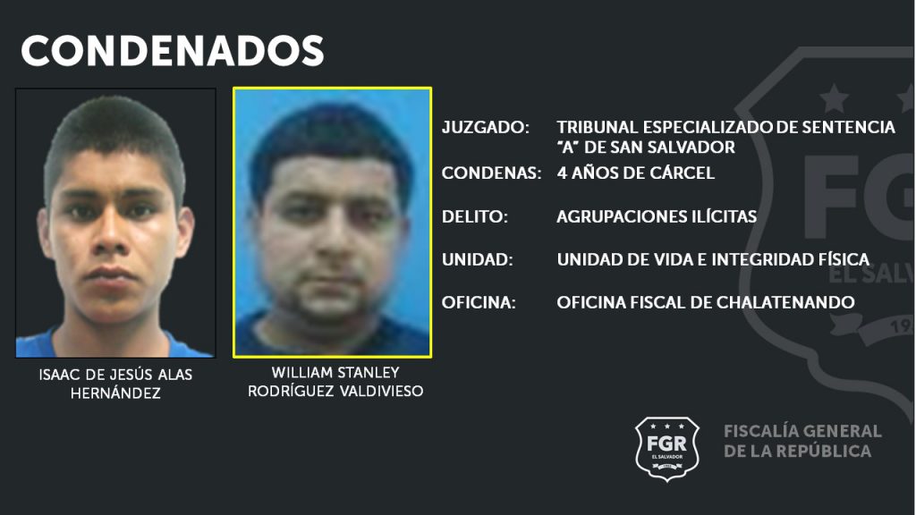 Chalatenango. La Unidad de Vida e Integridad Física de la Oficina Fiscal de Chalatenango logró que el Tribunal Especializado de Sentencia “A” de San Salvador condenara a cuatro años de prisión a William Stanley Rodríguez Valdivieso e Isaac de Jesús Alas Hernández, luego de ser encontrados culpables del delito de Agrupaciones Ilícitas.