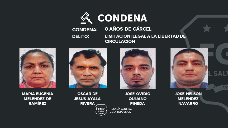 Santa Tecla, La Libertad. Cuatro pandilleros de la MS fueron condenados a prisión por haber limitado la libre circulación de dos víctimas en San Juan Opico, La Libertad Centro. Los pandilleros condenados a ocho años de prisión son: José Nelson Meléndez Navarro, alias “chupi”, José Ovidio Quijano Pineda, Óscar de Jesús Ayala Rivera y María Eugenia Meléndez de Ramírez.