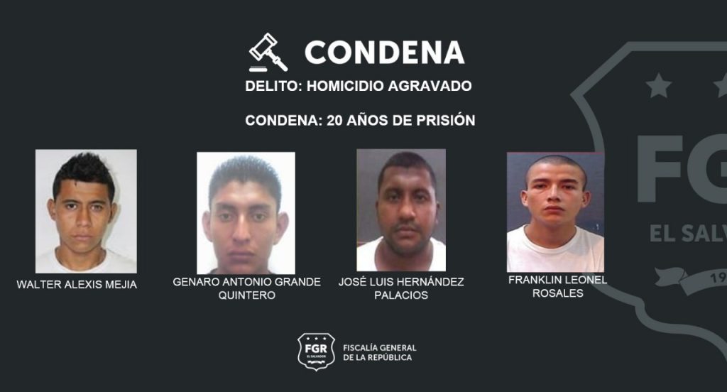 Zacatecoluca, La Paz. 20 años deberán permanecer en una prisión, los pandilleros Franklin Leonel Rosales, José Luis Hernández Palacios, Genaro Antonio Grande Quintero y Walter Alexis Mejía, todos miembros de la Mara Salvatrucha, MS-13, quienes fueron juzgados por el asesinato de una víctima en el departamento de La Paz.