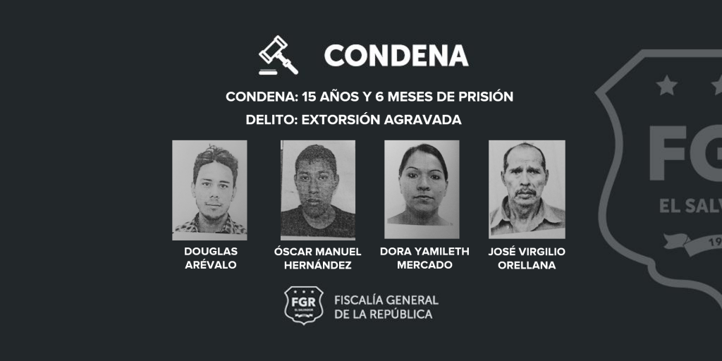 Cabañas. Por el delito de Extorsión Agravada, la Unidad de Delitos Relativos al Patrimonio Privado de la Oficina Fiscal de Ilobasco logró una condena de 15 años y seis meses de prisión para cuatro personas que que delinquían en el municipio de Sensuntepeque, Cabañas.