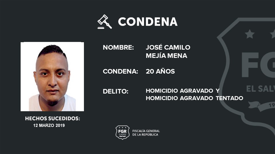 San Salvador. Otro miembro de estructura criminal deberá cumplir una condena de 20 años en prisión al quedar demostrado, que fue el responsable de la muerte violenta de una persona, así como causar lesiones a una segunda víctima. Este hecho sucedió en Ayutuxtepeque.