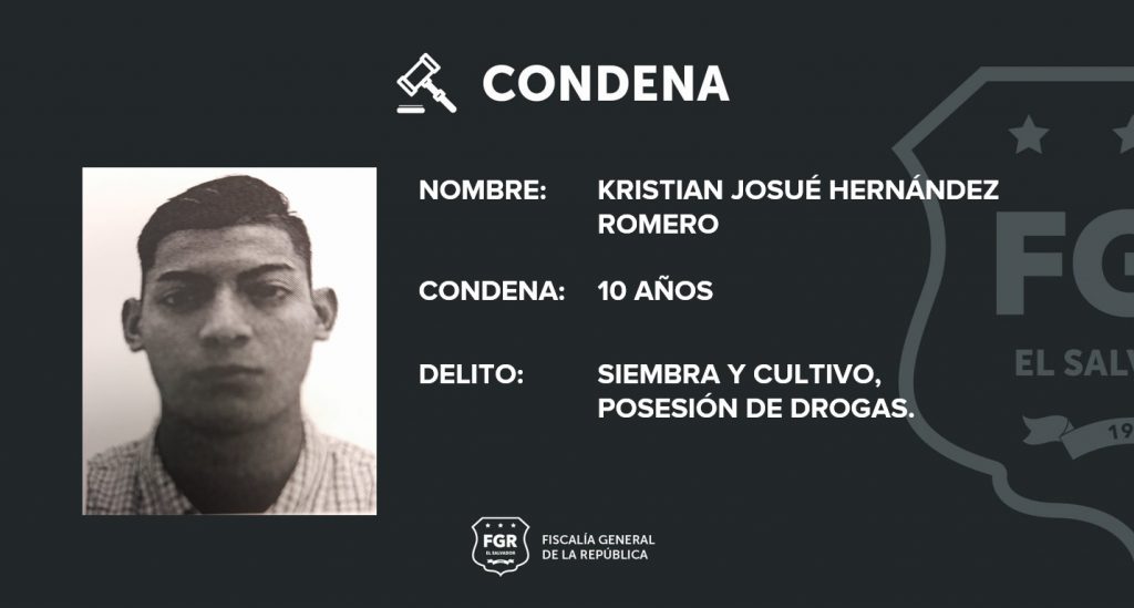 Cojutepeque, Cuscatlán. La Fiscalía logró condenar a Kristian Josué Hernández Romero a 10 años de prisión por los delitos de Tenencia, Portación o Conducción Ilegal o Irresponsable de Arma de Fuego, Siembra y Cultivo, Posesión y Tenencia de Drogas.