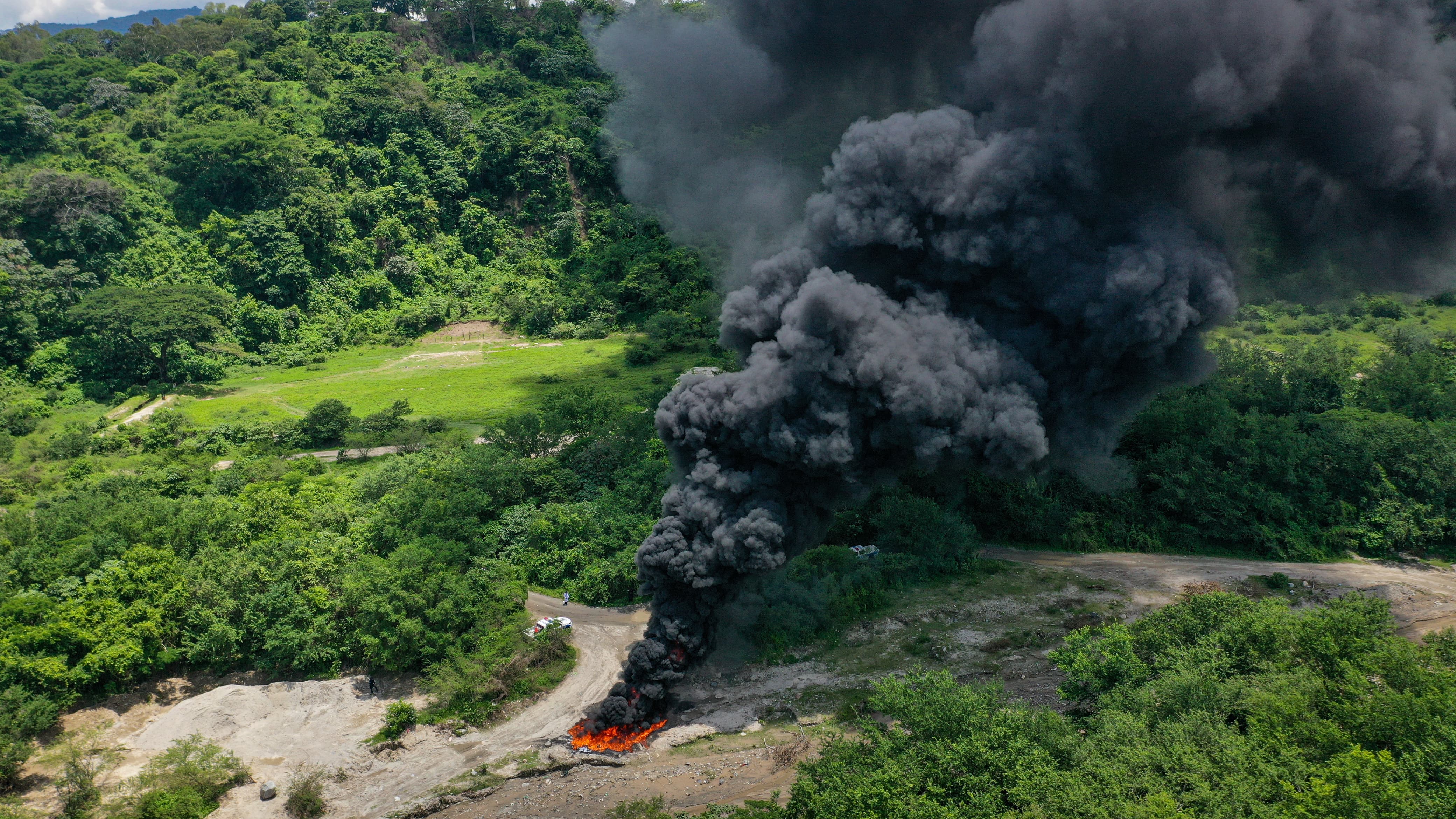 Changallo, Ilopango. La Fiscalía General de la República en coordinación con la Policía Nacional Civil procedieron a la destrucción de 1000 kilos de cocaína,  con un valor económico de $25,140.000.00, en Changallo, Ilopango.