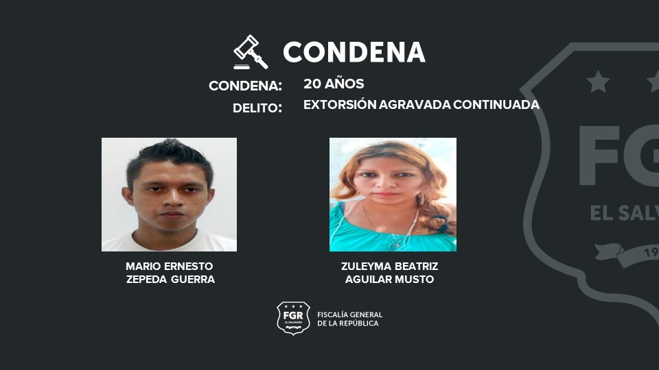Santa Ana. Mario Ernesto Zepeda Guerra y Zuleyma Beatriz Aguilar Musto fueron condenados a 20 años de prisión por haberse lucrado del trabajo de un salvadoreño honrado y trabajador, al exigirle la extorsión mes a mes. La Fiscalía logró documentar y evidenciar el delito cometido por ambos imputados.