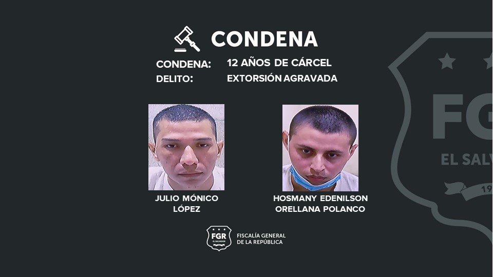 Santa Tecla, La Libertad. La Fiscalía General de la República (FGR) logró que dos terroristas de la pandilla 18 Revolucionarios, identificados como Julio Mónico López y Hosmany Edenilson Orellana Polanco, fueran condenados a 12 años de prisión, por haber extorsionado con $5,000 dólares a un comerciante de Ciudad Arce, La Libertad.