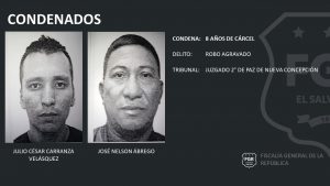 Chalatenango. Fiscales de la Unidad de Patrimonio Privado de la oficina fiscal en Chalatenango, lograron que el Juzgado Segundo Paz de Nueva Concepción Chalatenango, declarara culpables a José Nelson Abrego, de 58 años y Julio César Carranza Velásquez, de 40 años, acusados de Robo Agravado; dictándoles así una condena de ocho años de cárcel para cada uno, quienes actuaron en perjuicio de una víctima, el 21 de agosto de 2021, en el municipio de Nueva Concepción, Chalatenango.