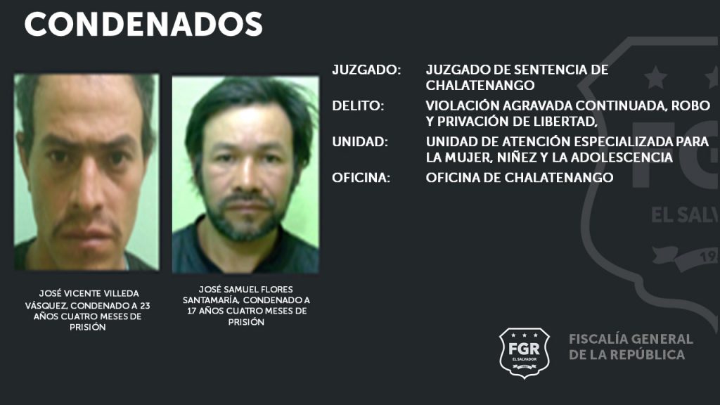 Chalatenango. El Tribunal de Sentencia de Chalatenango condenó a José Vicente Villeda Vásquez, a cumplir una condena de 23 años con 4 meses de prisión, y José Samuel Flores Santamaría, fue sentenciado a 17 años cuatro meses de prisión, después de ser declarados culpables de los delitos de Violación Agravada Continuada, Robo y Privación de Libertad, en perjuicio de una víctima con régimen de protección.