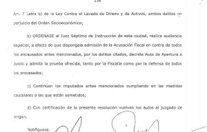 Y “b) ORDENASE al Juez Séptimo de Instrucción de esta ciudad, realice audiencia especial, a efecto de que disponga la admisión de la Acusación Fiscal en contra de todos los encausados antes mencionados, por los delitos citados, decrete Auto de Apertura a Juicio y admita la prueba ofrecida, tanto por la Fiscalía como por la defensa de todos los procesados”.