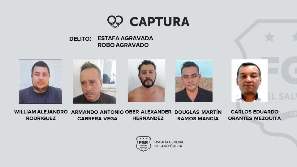El operativo se realizó en las zonas de Santa Ana, Chalachuapa, El Congo, San Sebastián Salitrillo y Metapán y fue posible capturar a Wiliiam Alejandro Rodríguez, Armando Antonio Cabrera Vega, Ober Alexander Hernández, Douglas Martínez Ramos Mancía y Carlos Eduardo Orantes Mezquita, a estos imputados se les acusa de robo agravado o estafa agravada.