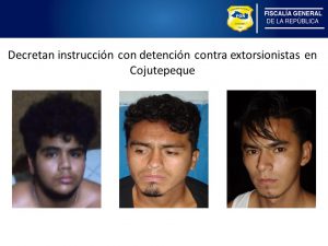 Mientras que Fiscales de la Unidad de Patrimonio lograron que el Juzgado Segundo de Paz de Cojutepeque, les decretara la detención provisional a los integrantes de la pandilla 18 sureños, Oscar Geovany Ortiz Juárez, José Isaac Antonio Flores y Brandon Francisco Paz Melgar, por exigir a un comerciante US$500.00 mensuales. Los chantajes se registraron el 27 de julio de este año.