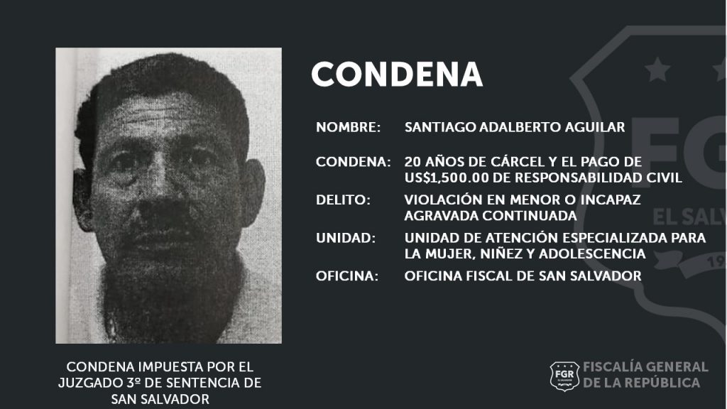 San Salvador. La Unidad de Atención Especializada para la Mujer, Niñez y Adolescencia de la oficina fiscal de San Salvador informaron que Santiago Adalberto Aguilar ha sido condenado a 20 años de prisión por el delito de Violación Agravada en Menor, modalidad Continuada.