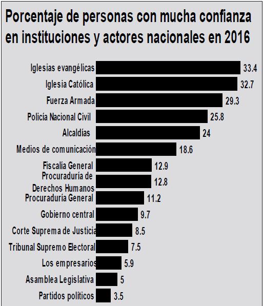 Además, se destacó que de todas las instituciones por las que se consultó, las que registraron un mayor crecimiento en sus niveles de confianza pública respecto al año anterior, fueron las Iglesias evangélicas, seguidas de la PNC y la FGR.