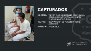 Los implicados responden a los nombres de Víctor Vladimir Morales Cruz, Rafael Obdulio Hernández Ramos y Nery Vladimir Castillo Rivas, todos miembros de la Pandilla 18 Sureños, que operan en las inmediaciones de la residencial San Antonio y La Campanera, de Soyapango.