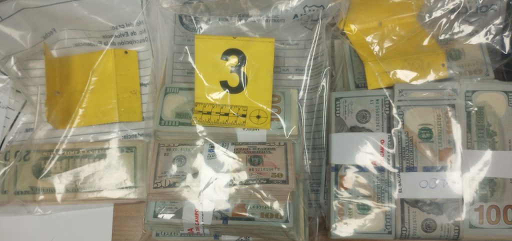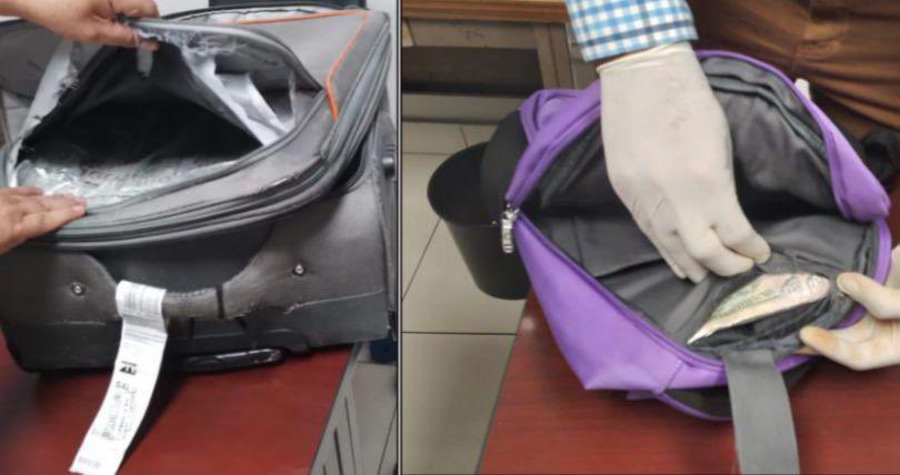 A través del procedimiento respectivo de chequeo se le detectó el dinero en compartimientos ocultos en una maleta y una mochila. Al realizar la prueba de ion scan a los billetes, dio positivo a residuos de cocaína y éxtasis.