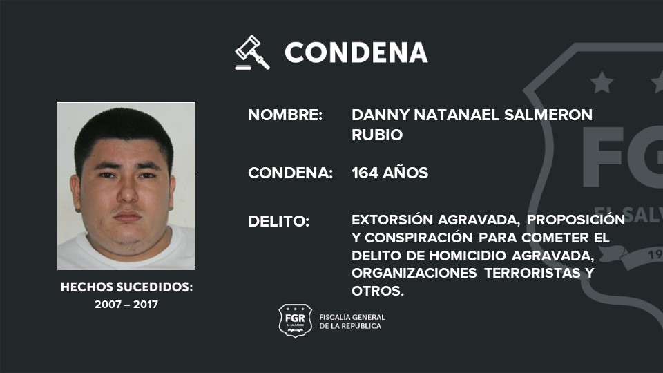 Danny Natanael Salmerón Rubio, alias punicher, recibió una sentencia condenatoria de 164 años de cárcel por 3 extorsiones agravadas, organizaciones terroristas, 1 homicidio agravado y 6 casos de proposición y conspiración para cometer el delito de homicidio agravado.