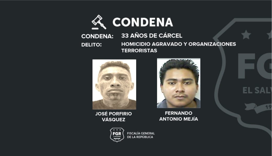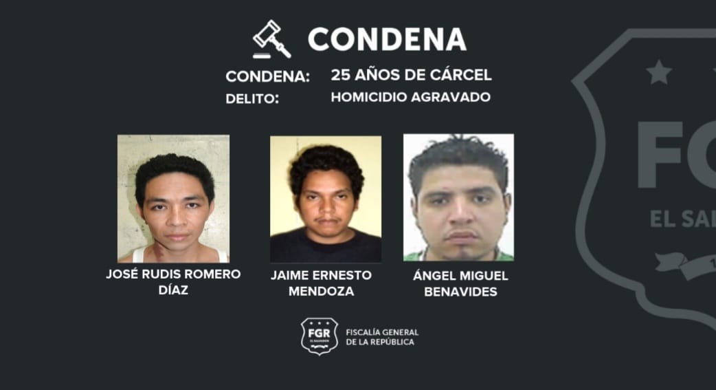 Elmer Enrique González Gutiérrez, alias meme, fue condenado a 58 años de prisión, por 2 homicidios agravados y organizaciones terroristas; Nasser Antonio Benavides Lovo, alias Serafín, fue sentenciado a 50 años por 2 homicidios agravados, y a Wilfredo López Larín, alias wilo, se le condenó a 43 años de cárcel por 1 homicidio agravado y 2 privaciones de libertad.