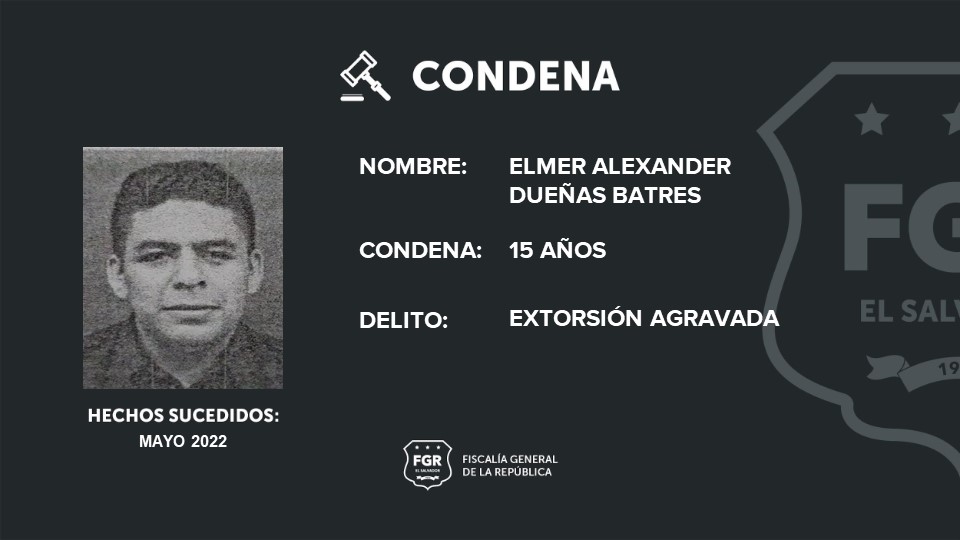 Santa Ana. Elmer Alexander Dueñas Batres fue sentenciado a 15 años de prisión por el delito de extorsión; el imputado se valió de su cargo como agente policial y le exigió $200.00 dólares al dueño de un taller mientras realizaba un patrullaje preventivo en una zona de Santa Ana. Los hechos iniciaron el cinco de mayo del 2022.