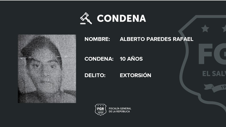 Sonsonate. Una vez más, la Fiscalía General de la República da respuesta a las personas que en el pasado fueron víctimas de pandilleros que les imponían la renta y se lucraban de su trabajo; con las pruebas suficientes los fiscales lograron que a Alberto Paredes Rafael se le condenara a diez años de cárcel por haber cometido el delito de Extorsión.