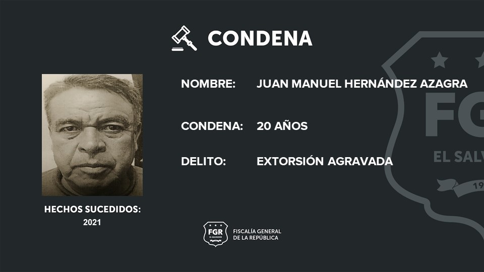 Santa Tecla, La Libertad Sur. La Fiscalía General de la República (FGR) logró 20 años de cárcel para Juan Manuel Hernández Azagra por haber extorsionado a un empresario de camiones durante dos años en San juan Opico, La Libertad Centro.