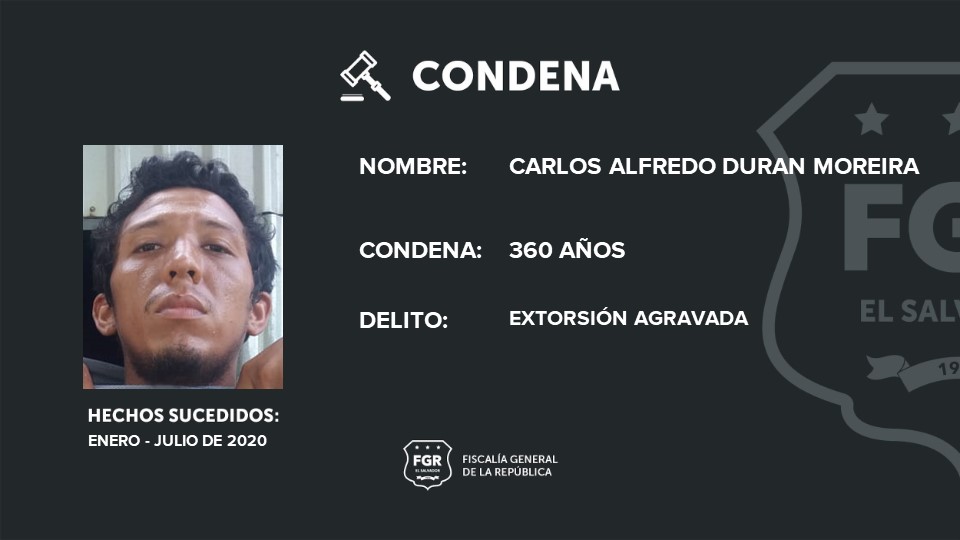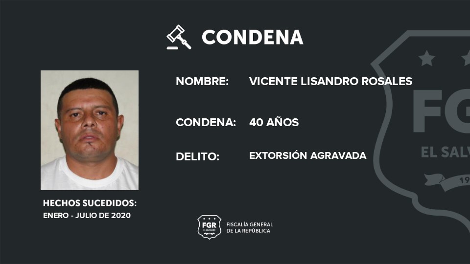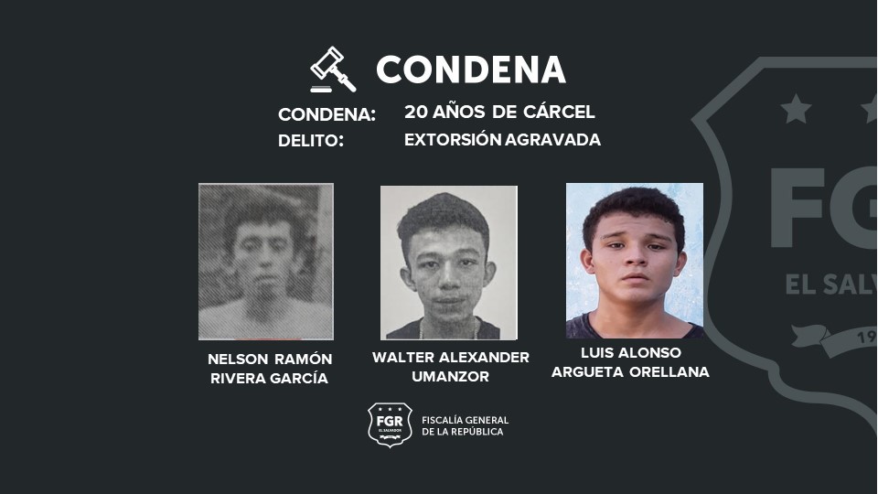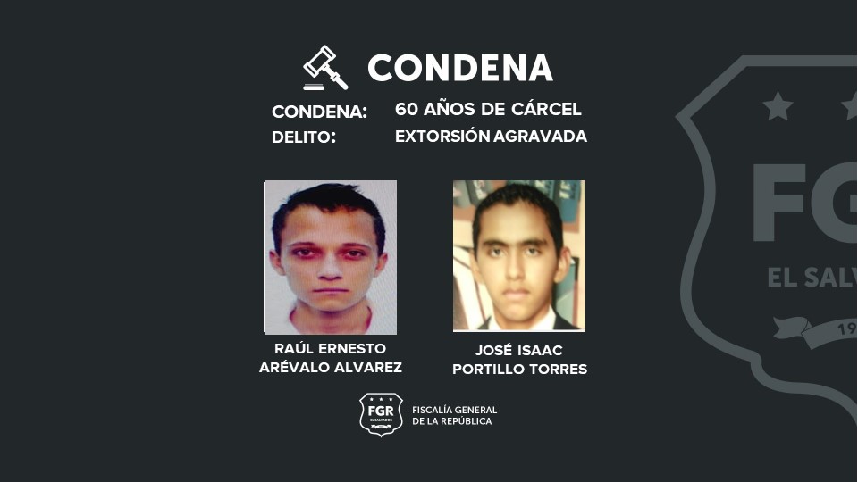 Además, Raúl Ernesto Arévalo Álvarez, alias Raúl y José Isaac Portillo Torres, alias drácula, recibieron una sentencia condenatoria de 60 años de cárcel por 3 extorsiones agravadas, y Vicente Lisandro Rosales Medrano, alias topo, fue condenado a 40 años de prisión por 2 extorsiones agravadas.