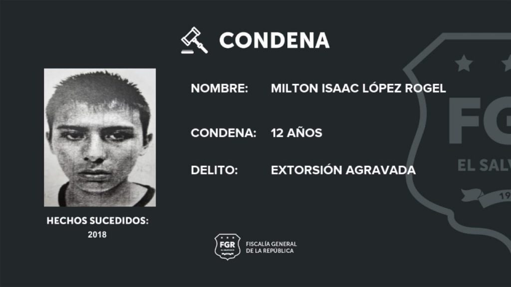 La Libertad. Un pandillero de la MS-13, identificado como Milton Isaac López Rogel, fue condenado a 12 años de prisión por haber extorsionado a un comerciante de Zaragoza, La Libertad.