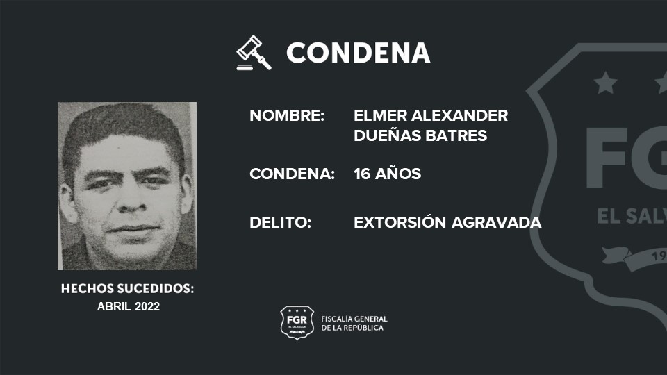 El caso avanzó hasta la etapa de juicio y la Fiscalía presentó las pruebas que demostraron la culpabilidad de esta persona, por lo que el Tribunal Primero de Sentencia de Santa Ana lo condenó a 16 años de prisión por encontrarlo responsable del delito de extorsión agravada.