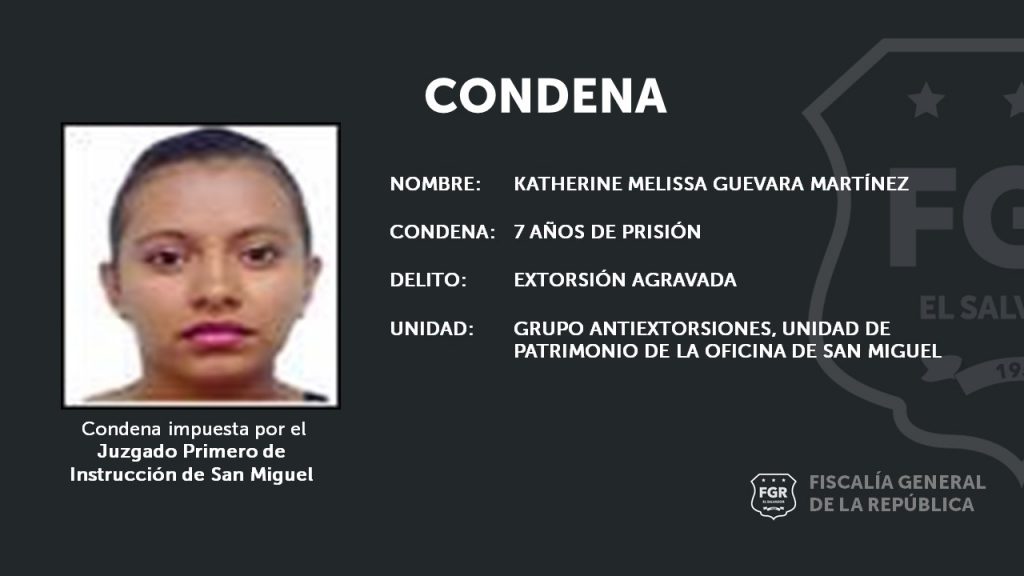 Katherine Melissa Guevara Martínez recibió el dinero mediante 5 entregas a su cuenta bancaria. Por su participación fue condenada a 7 años de cárcel, afirmó la Fiscal del caso del grupo Antiextorsiones de la oficina de San Miguel.