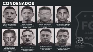 Fiscales de la Unidad de Patrimonio Privado y Propiedad Intelectual en Zacatecoluca, confirmaron que el Tribunal Segundo de Sentencia de esta jurisdicción condenó a los pandilleros Fabricio Adonay Rosales Aragón, a 17 años de prisión; William Ángel Rosales, a 15 años; Enrique Alexander Hernández Rodriguez y Francisco Josué Navarrete Cruz, a 12 años; Guillermo Antonio Martinez Hernández y Milton Mauricio Cortez Hernández, a 10 años; Shaffik Ricardo Flores Santos, a ocho años, y Juan Nelson Reyes Hernández, a seis años, por el delito de Extorsión Agravada.