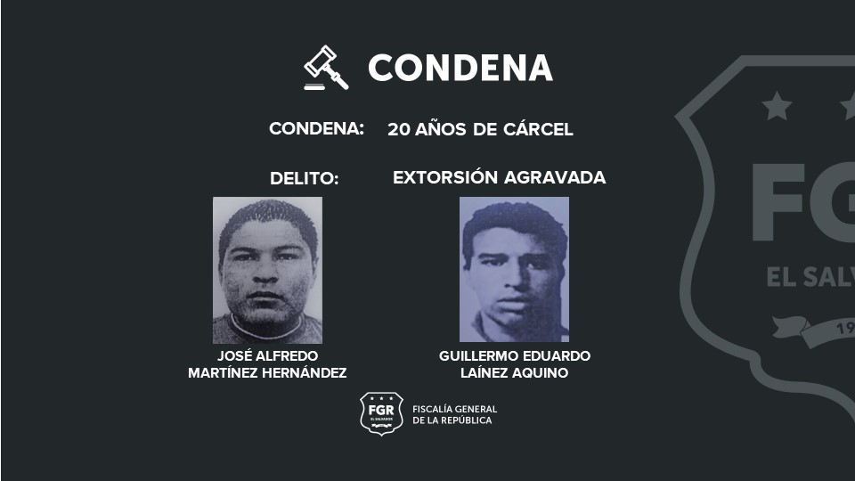 San Salvador. Guillermo Eduardo Laínez Aquino y José Alfredo Martínez Hernández fueron sentenciados a 20 años de prisión por haber cometido el delito de extorsión. Los imputados son miembros de una estructura criminal y afectaron económicamente a un un comerciante de la jurisdicción del distrito de Mejicanos, en el municipio San Salvador Centro.