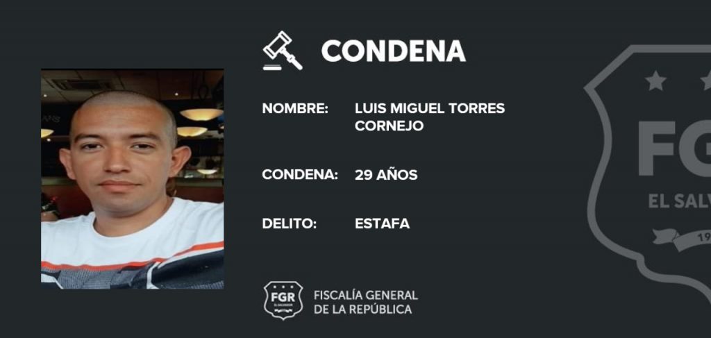 San Vicente. La Unidad de Delitos Relativos al Patrimonio Privado de la Oficina Fiscal de San Vicente logró condenar a Luis Miguel Torres Cornejo a 29 años de cárcel y a pagar $57,750 dólares, en concepto de responsabilidad civil por estafar a 14 víctimas, a quienes les hacía creer que se dedicaba a la importación de vehículos.