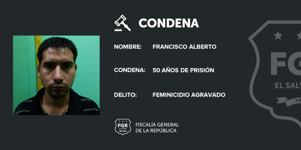 Chalatenango. La FGR por medio de la Unidad de Atención Especializada para la mujer, Niñez y Adolescencia (UAEMNA), logró que el Juzgado Especializado de Sentencia para Una Vida Libre de Violencia para las Mujeres de San Salvador condenara a Francisco Alberto a cumplir una pena de 50 años de prisión, por el delito de Feminicidio Agravado en perjuicio de su exnovia.