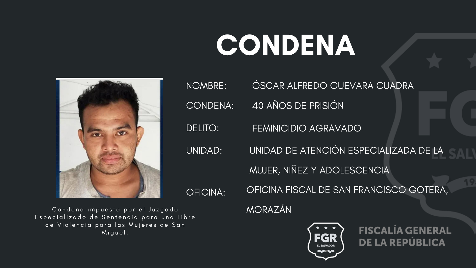 La sentencia condenatoria fue impuesta por el Juzgado Especializado de Sentencia para una Libre de Violencia para las Mujeres de San Miguel, el cual valoró las pruebas presentadas por la FGR las cuales fueron suficientes para que que le impusiera a Óscar Guevara una condena de 40 años de prisión, más el pago por la Responsabilidad Civil de $10,000 dólares.