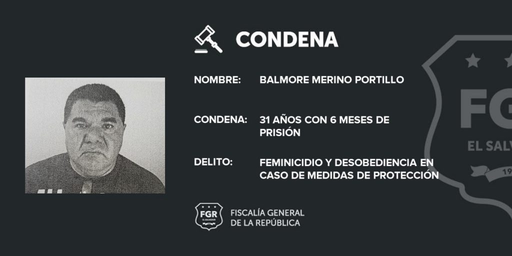 San Miguel. Con suficientes pruebas periciales, documentales y testimoniales, la Fiscal de la Unidad de Atención Especializada para la Mujer, Niñez y Adolescencia, de la oficina de San Miguel, demostró que Balmore Merino Portillo cometió el delito de Feminicidio en perjuicio de su excompañera de vida; en ese sentido se logró 31 años y medio de prisión para el feminicida.