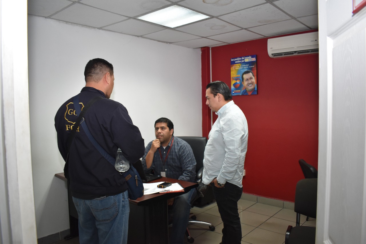 Durante el registro con prevención de allanamiento iniciado por la FGR en todas las empresas se recolectan documentos contables, informáticos y financieros que puedan ser útiles en las investigaciones penales, las cuales continuarán en los próximos días, informó German Arriaza, Director Contra la Corrupción y la Impunidad.
