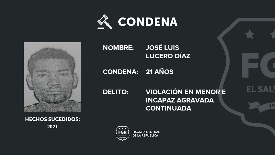 Santa Ana. La Fiscalía General de la República logró que José Luis Lucero Díaz fuera sentenciado a 21 años de prisión por el delito de Violación En Menor E Incapaz Agravada Continuada en perjuicio de su hija.