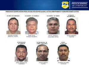 Los detenidos son: Edgar Antonio Mendoza Castro, exdirector de I.N. Rafael Ernesto Villalobos Artiga, exgerente administrativo, Ángel Elías Vásquez Figueroa, exgerente de Finanzas, Edgar Armando Fuentes, exenlace de compras, Esteban Galdámez González, Encargado de Activo Fijo y Mario Ernesto Gil Guerrero, exencargado de Almacén.