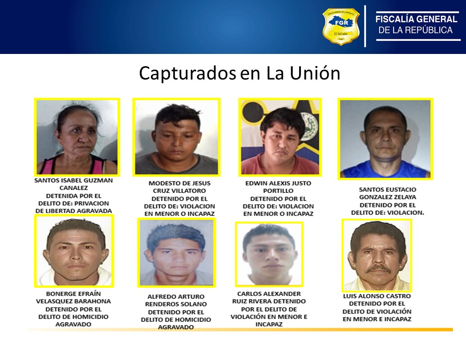 En La Unión se aprehendieron a 21 personas, entre ellos, algunos miembros de la MS, vinculados en tres Homicidios Agravados, seis casos de Violación en Menor e Incapaz y una Privación de Libertad. Las detenciones se realizaron en los municipios de Conchagua, Anamorós, Intipucá, Santa Rosa de Lima, Concepción de Oriente y Polorós.