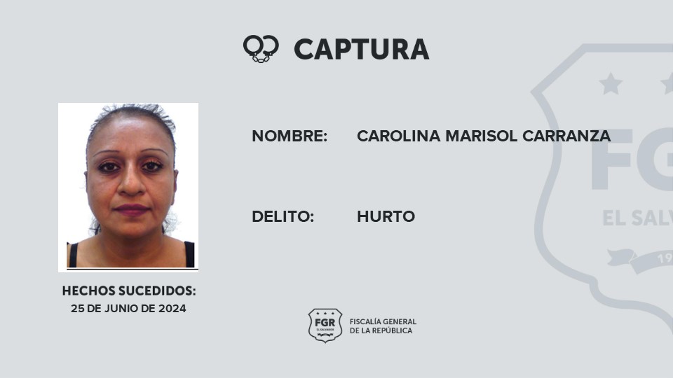 Carolina Marisol Carranza fue capturada por hurtar $714 dólares. La imputada llegó el 25 junio de este año a un bazar de ropa ubicado en el distrito de La Unión y cuando nadie la veía tomó la cartera de la propietaria e ingresó a los vestidores donde le hurtó el dinero; dejando posteriormente la cartera en el mismo lugar.