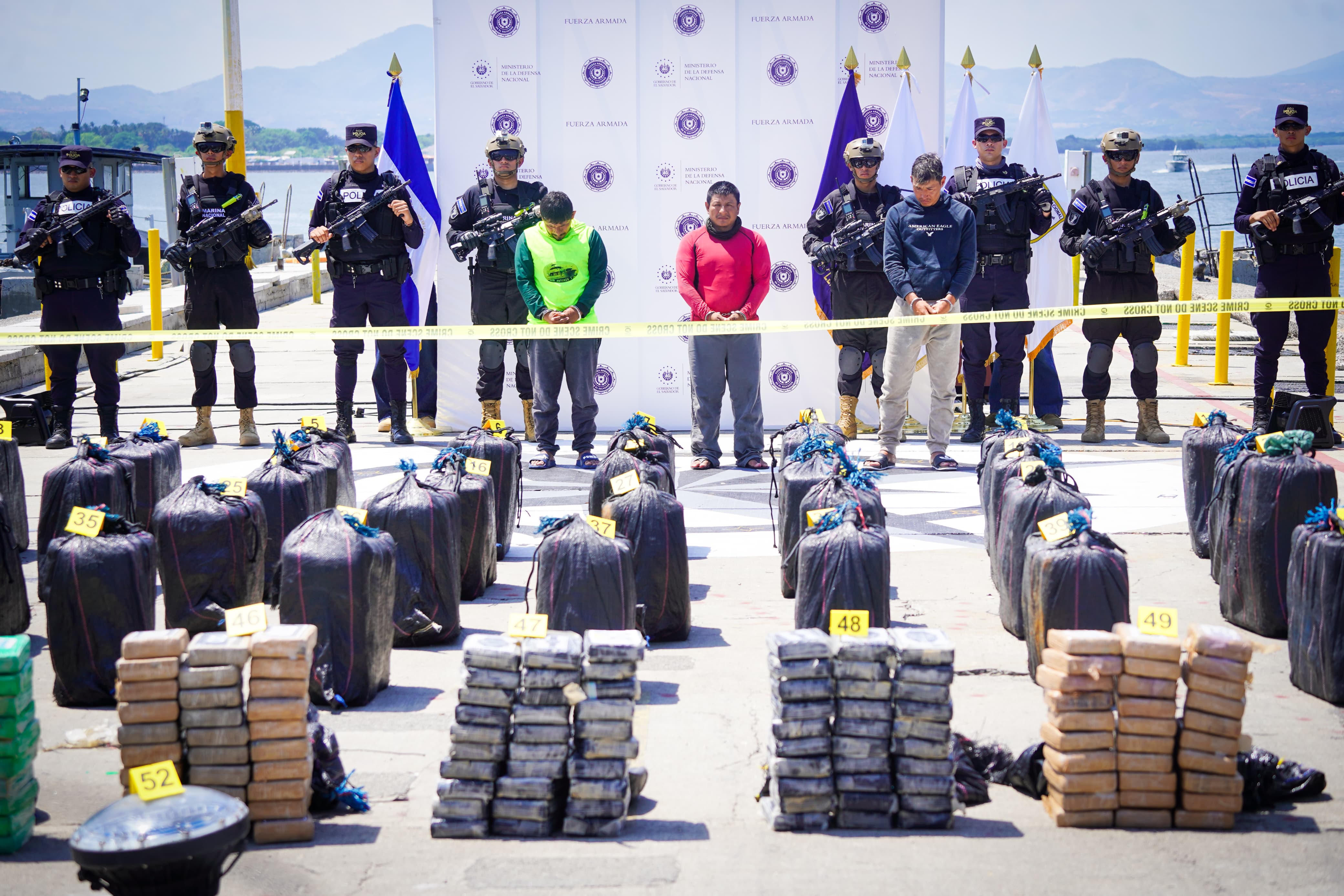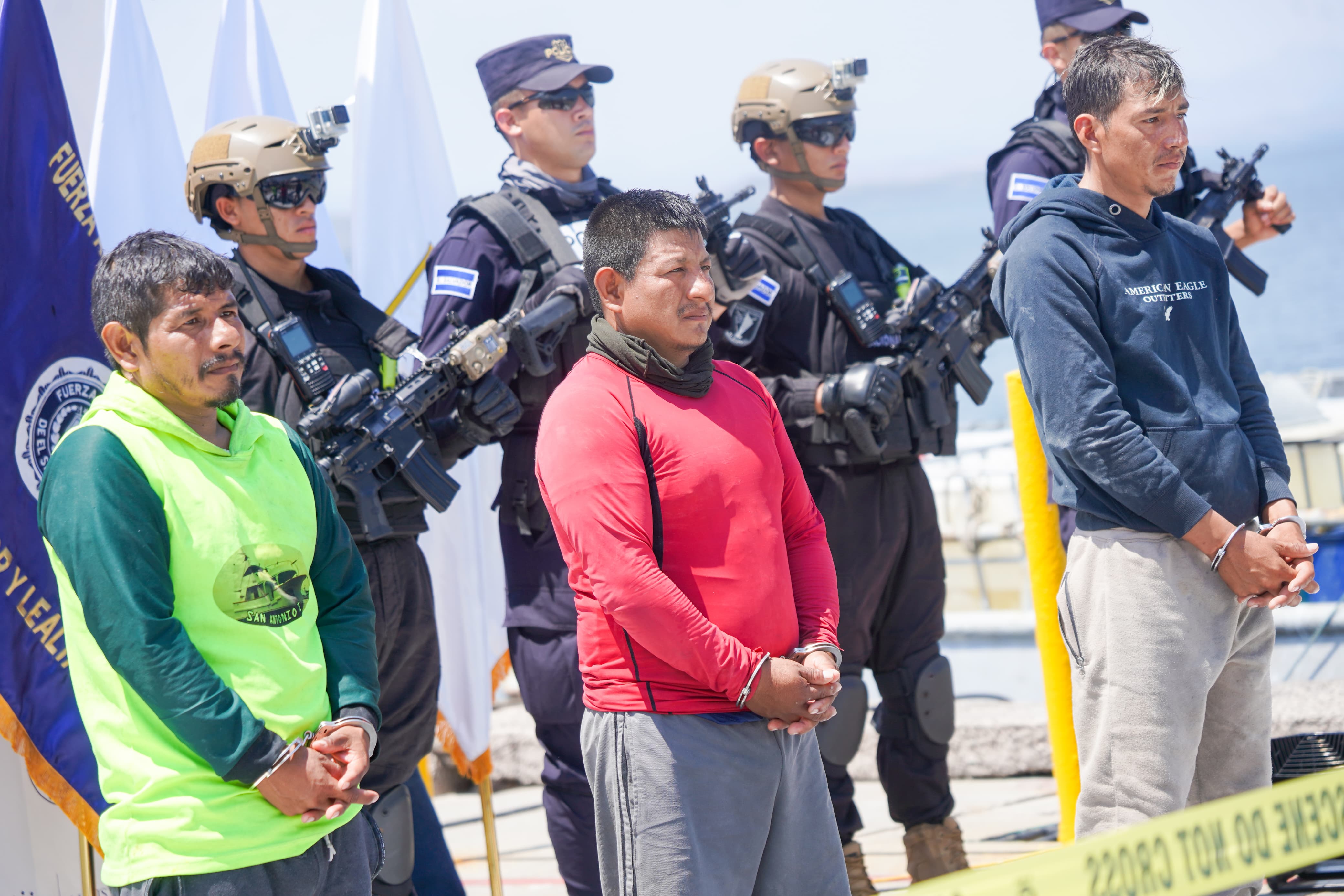 La Unión. Autoridades del Gabinete de Seguridad ampliado y la Fiscalía General de la República (FGR) presentaron la droga que recientemente fue incautada en altamar y a los 3 extranjeros que la transportaban. Los detenidos son de nacionalidad ecuatoriana y fueron intervenidos a 600 millas náuticas al suroeste de la Bocana El Cordoncillo, en el Estero de Jaltepeque.