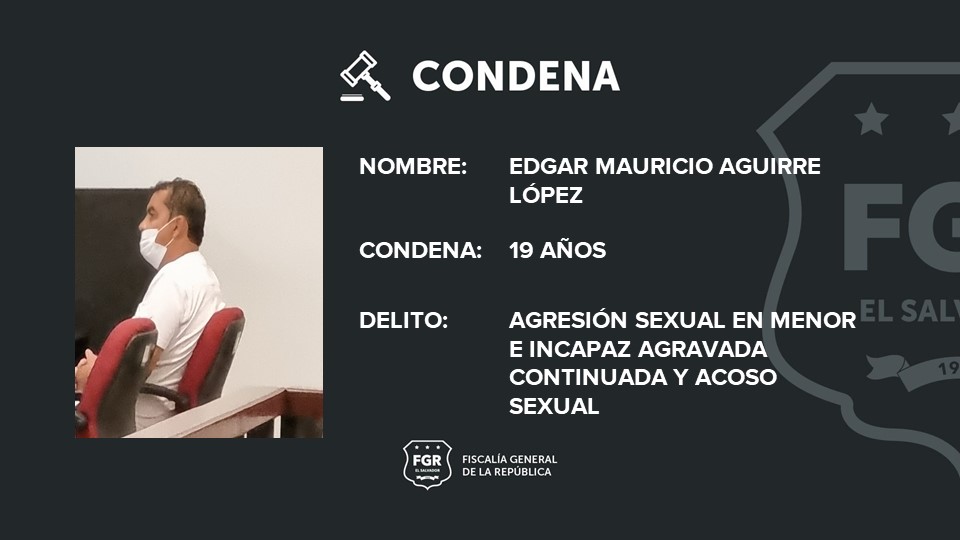 Santa Tecla. 19 años de cárcel fue el castigo que la Fiscalía General de la República (FGR) logró que se le impusieran a Edgar Mauricio Aguirre López, por haber agredido y acosado sexualmente a una niña desde que tenía once años y los abusos se dieron durante cuatro años.