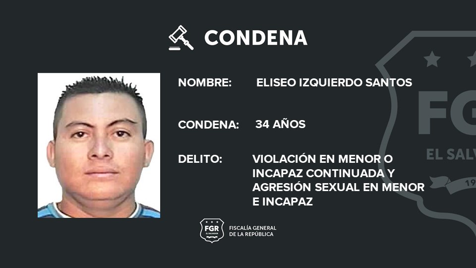 La Fiscalía General de la República (FGR) logró una sentencia de 34 años de cárcel para Elíseo Izquierdo Santos, de 34 años de edad, por haber abusado sexualmente de una niña de 9 años, al interior de un centro educativo en el año 2021, en el municipio de Tejutla, Chalatenango.