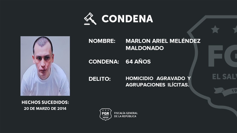 Tras la evidencia presentada, el Tribunal Segundo contra el Crimen Organizado B de San Miguel decretó la pena máxima para homicidio agravado -50 años- por la saña con la que asesinó a la víctima. Además, la FGR logró que el tribunal condenara a 14 años de cárcel al procesado por agrupaciones ilícitas. La entidad fiscal demostró en juicio que Meléndez Maldonado tenía el cargo de corredor del programa San Miguel de la clica CHLS de la MS-13, que delinquían en el cantón Chilanguera, del municipio de Chirilagua, en San Miguel y en el municipio Jucuarán, de Usulután.
