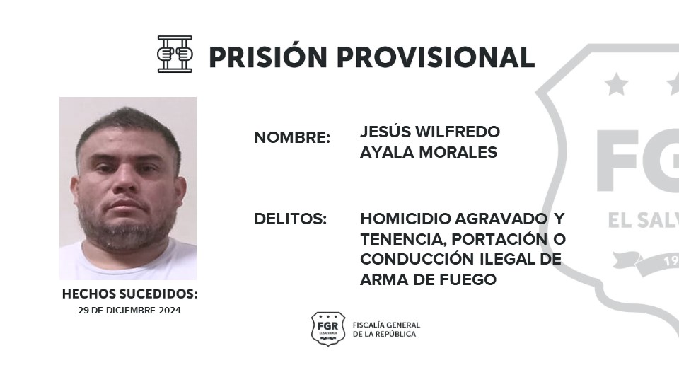 Soyapango, San Salvador Este. Jesús Wilfredo Ayala Morales permanecerá en prisión mientras avanzan las investigaciones en su contra y fue enviado directamente al centro penitenciario La Esperanza. El imputado es acusado de homicidio agravado, y tenencia, portación o conducción ilegal de arma de fuego.