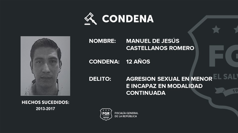 Sonsonate. Manuel de Jesús Castellanos Romero fue sentenciado a 12 años de cárcel gracias a las pruebas presentadas en juicio por la Fiscalía General de la República. Al imputado se le procesó por el delito de agresión sexual en menor e incapaz en modalidad continuada.