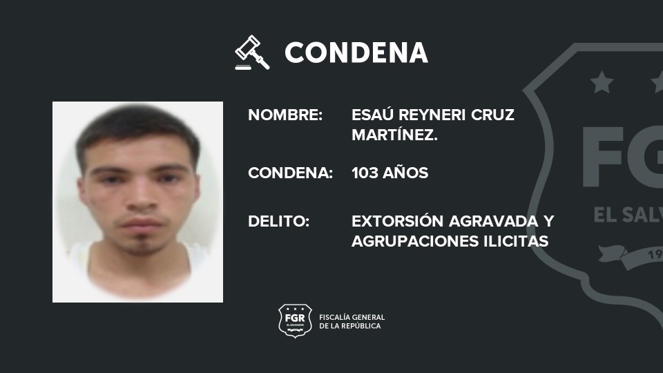 Gracias a las pruebas periciales, técnicas y testimoniales presentadas por el ente fiscal, el Juzgado Especializado de Sentencia de San Miguel condenó a Esau Reyneri Cruz Martínez, a 100 años de cárcel por extorsión agravada y a tres años más por Agrupaciones y Asociaciones Ilícitas. A este pandillero lo encontraron culpable de extorsionar a 5 víctimas.