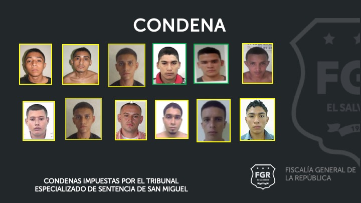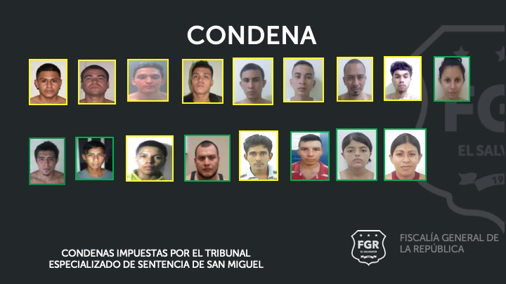 De un grupo de mareros formado por 96 imputados, 51 enfrentaron un juicio en el Juzgado Especializado de Sentencia de San Miguel, de los cuales 44 fueron condenados a diferentes penas de prisión y 7 absueltos; los demás son prófugos de la justicia.